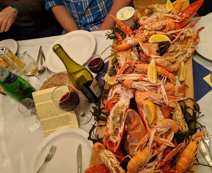 We don’t get out very much during the summer, but we made an exception on Saturday night to go to the Seafood extravaganza in Dervaig village hall. Six courses of the finest food, including an enormous seafood platter.