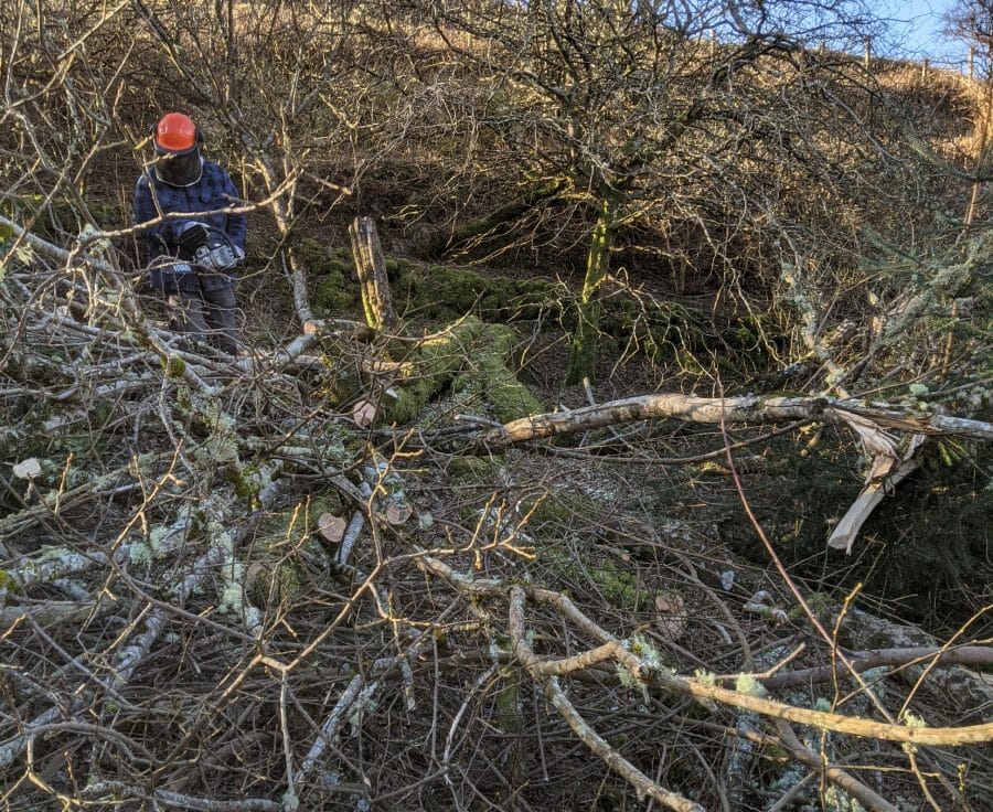 A recent spell of windy weather meant the largest of the trees covering the path was damaged and needed cutting down giving us the perfect opportunity to start work. It also meant Tom could use the chain saw so he was happy.