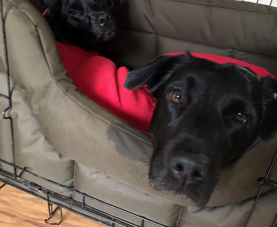 Our pups  are very lucky to have a range of comfy dog beds all over the house. Despite this, their favourite thing to do is to cuddle up together. Here they are in their Trover coats after a wet and muddy walk through the forest squished up in Simcoe’s crate.